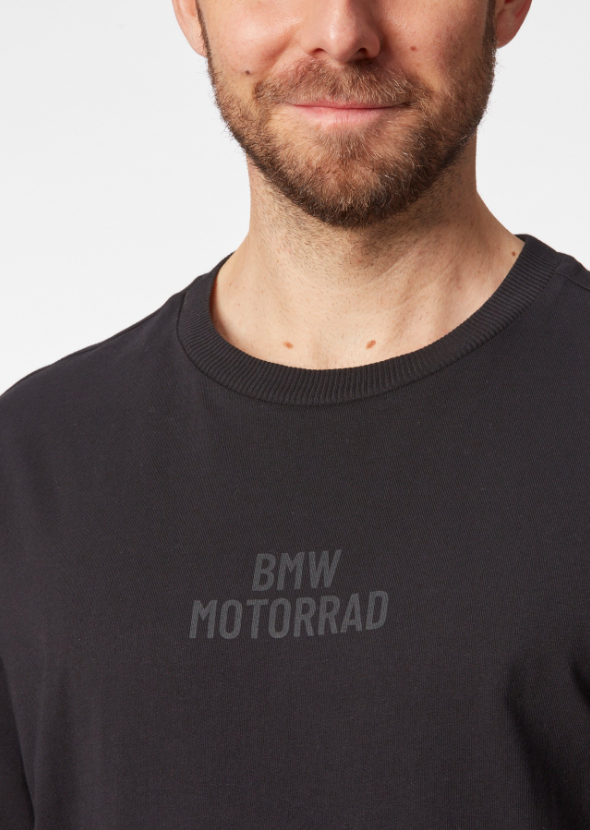 BMW Berlin built t-paidassa on löysempi istuvuus sekä olkapäiltä laskettu leikkaus . T-paidassa on BMW motorrad teksti edessä ja berlin built teksti takana.