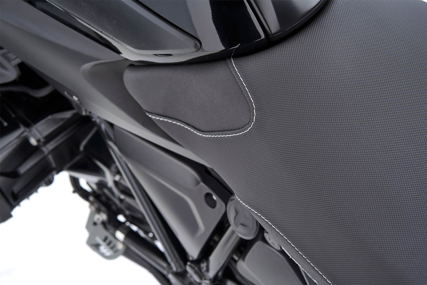 We manufacture our seats with a characteristic, ergonomic 3D contour that lets the rider become one with their BMW. The shape and angle of the carefully crafted, progressively structured, dual-layer seat core support the ergonomically beneficial, natural posture of the back. Integrated, riding is a relaxing affair and thus also active. And there’s no doubt that relaxed sitting adds a serious plus to passive safety. With the ThermoPro coating, the temperature of this seat in direct sun at the peak of summer is up to 25°C lower compared to standard, untreated cover materials. We also have a passenger seat in the range to go with this.